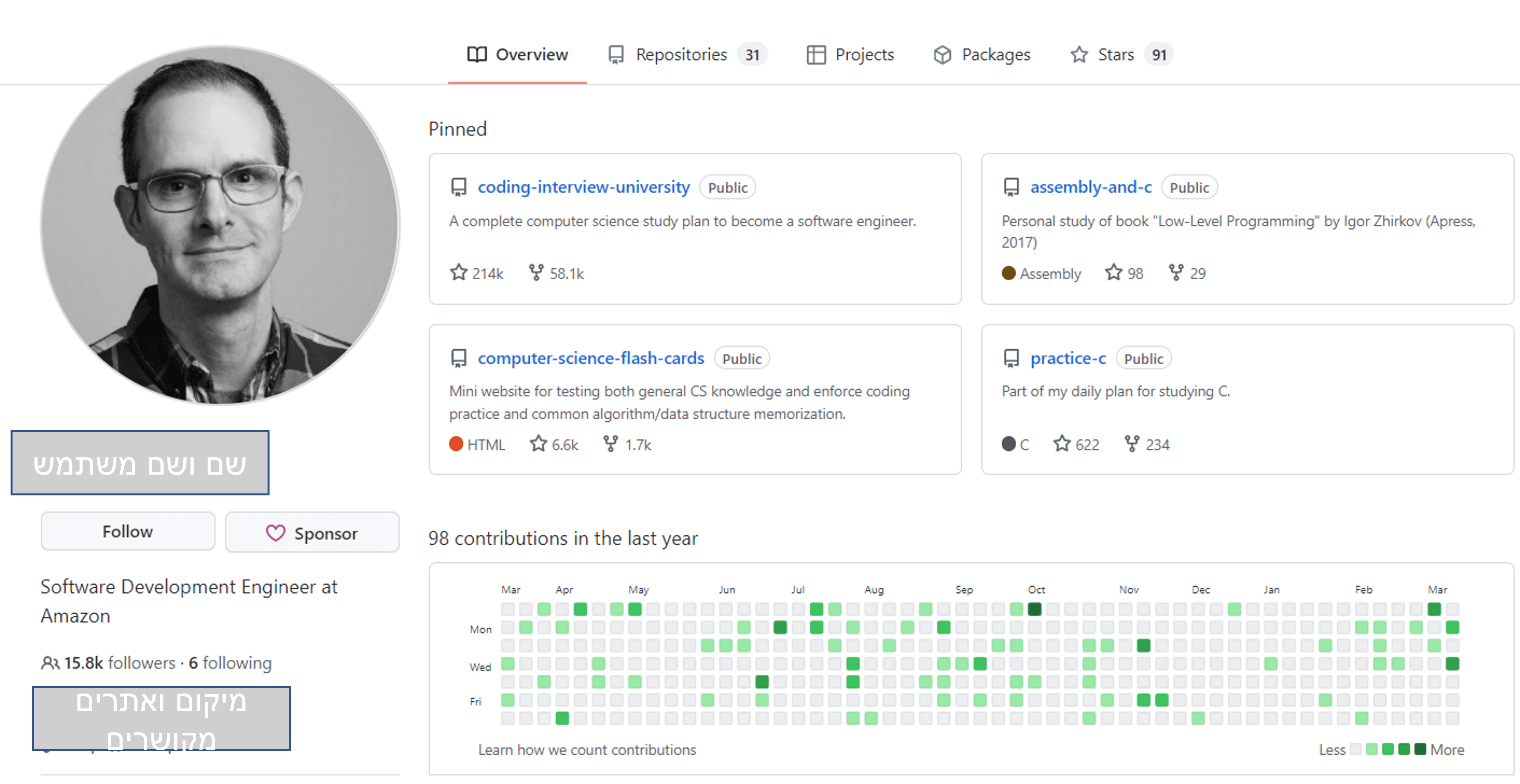 ויחד עם זאת – אנו נוכל למצוא (במידה והוזן) את השם ושם המשתמש של האדם, מיקום, מעסיק נוכחי, הדוא"ל שלו, אתרים מקושרים לפרופיל, קוד ששיתף ובאלו שפות נכתב, ומספר עוקבים ונעקבים, רמת הפעילות שלו על ציר הזמן ומספר הכוכבים שקיבל על תרומתו.