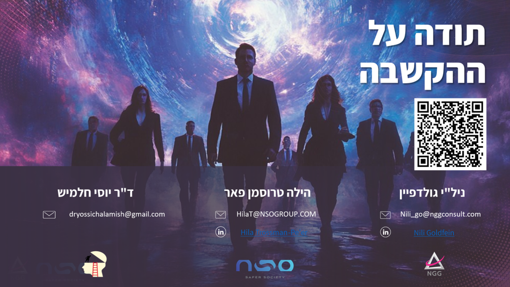 הנועזים שיכניסו את התפישות והמיומנויות הללו להארגון , יסייעו ביצירת דור חדש של מנהיגות ומנהיגים בעלי חוסן, המסוגלים להחזיק כאוס, להוביל מתוך נוכחות, לצמוח מתוך משבר,ולנווט בעולם שכבר ירד מהפסים.