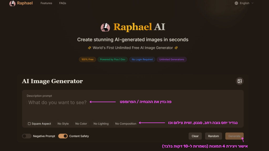 "איך ליצור תמונות מקצועיות וחינמיות לשימוש אישי ומסחרי?" – זו השאלה שמככבת בכל סדנה  או פורום מקצועי שאנחנו מובילים. אז תחזיקו חזק, כי יש לי בשורה מרעננת: לפני שבוע נחת עלינו Raphael AI – כלי שסוף סוף עושה את זה פשוט. נכון, אולי אין בו את כל כלי העריכה המתקדמים שתמצאו בפלטפורמות אחרות, אבל הוא מאפשר שימוש חופשי בלי רישום, בלי תשלום (בינתיים), בלי מגבלות, ובלי סימני מים מעצבנים על התמונות.