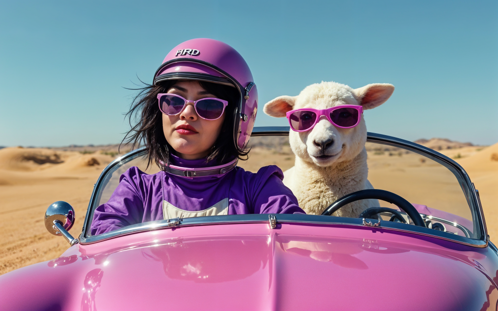 דוגמה בהשראת הנסיך הקטן 🌹יצרתי תיאור קצר ופשוט של הסצנה: A woman in a glossy purple spacesuit with 'HRD' on her chest, sitting on a small hill in a golden desert next to a fluffy white sheep. Between them is a red rose enclosed in a transparent dome, inspired by 'The Little Prince'. הרצתי את אותה הנחיה מספר פעמים, כשבכל פעם שיחקתי עם הסגנון, התאורה, הזווית וכדומה.