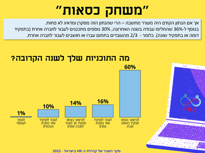 בנוסף ל-36% שהחליפו עבודה בשנה החולפת, עוד 30% מתכננים לעבור לתפקיד אחר בחברה אחרת. כלומר 2/3 מאנשי הגיוס ומשאבי אנוש עברו או יעברו מקום עבודה.